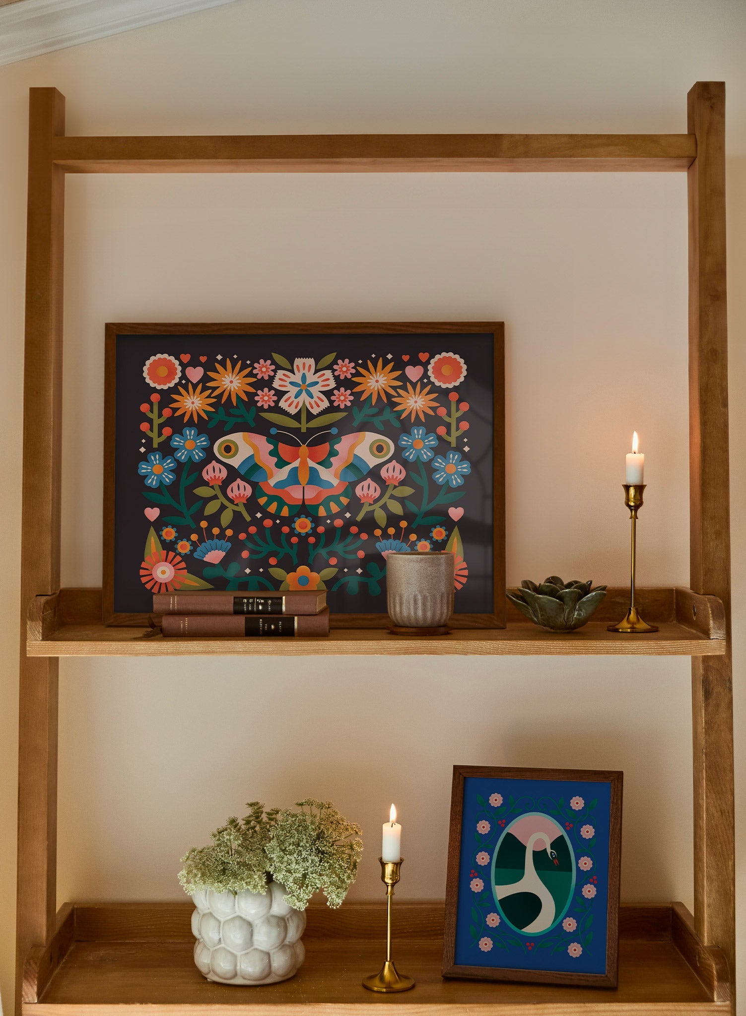 A bold burst of folklore and color, this print captures the delicate balance of nature in perfect harmony. Two mirrored butterflies, woven into a tapestry of wildflowers, create a stunning symmetrical display of movement and detail. The deep black background amplifies the warm golds, rich blues, and soft corals, making each element pop with vibrancy.