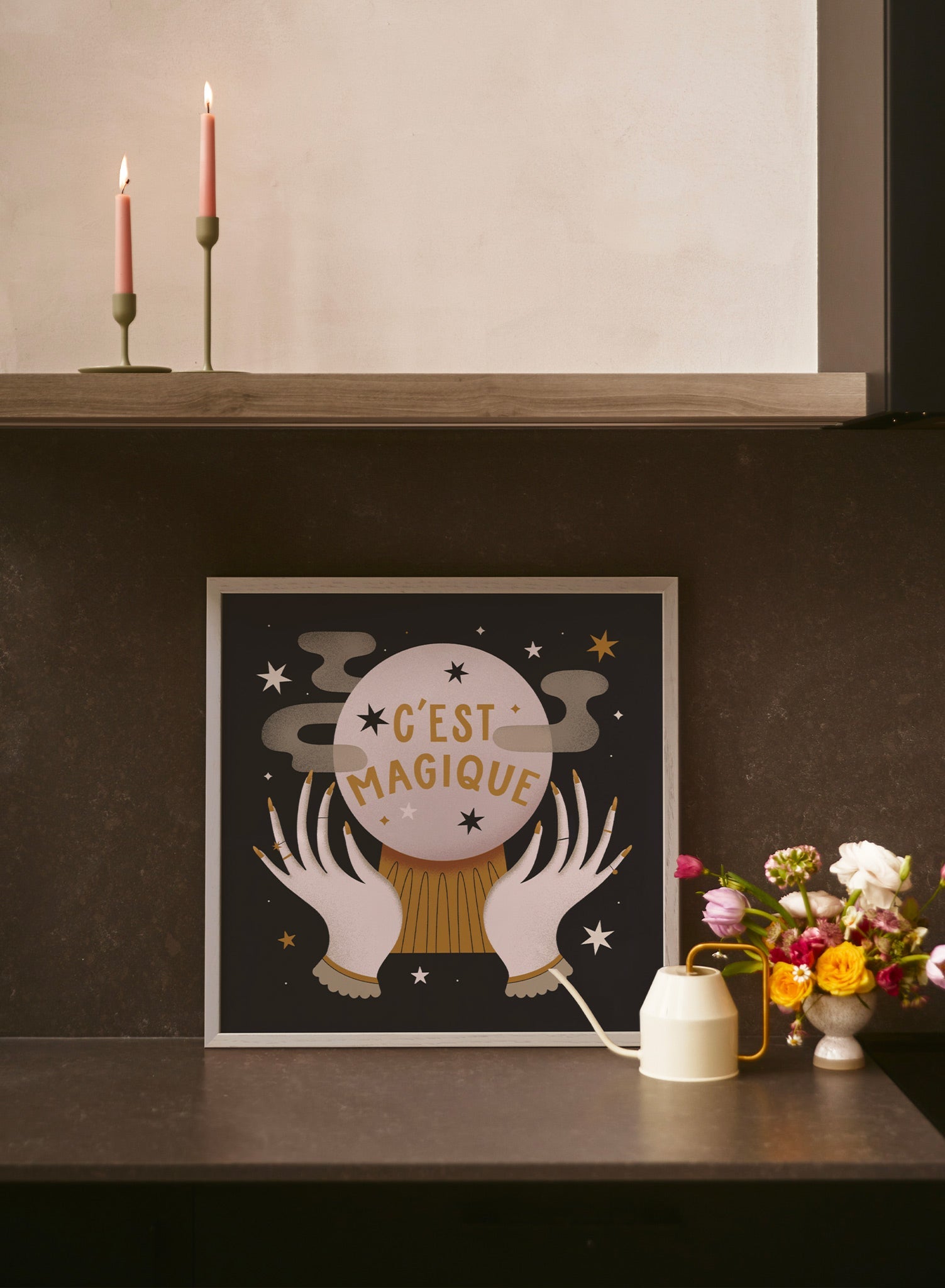 A glimpse into the mystical, this celestial print casts a spell of enchantment. A glowing crystal ball, framed by elegant hands, floats in a midnight sky scattered with golden stars and soft, swirling smoke. The French phrase 'C’est Magique' emerges as if whispered from the beyond, inviting a sense of wonder and mystery.