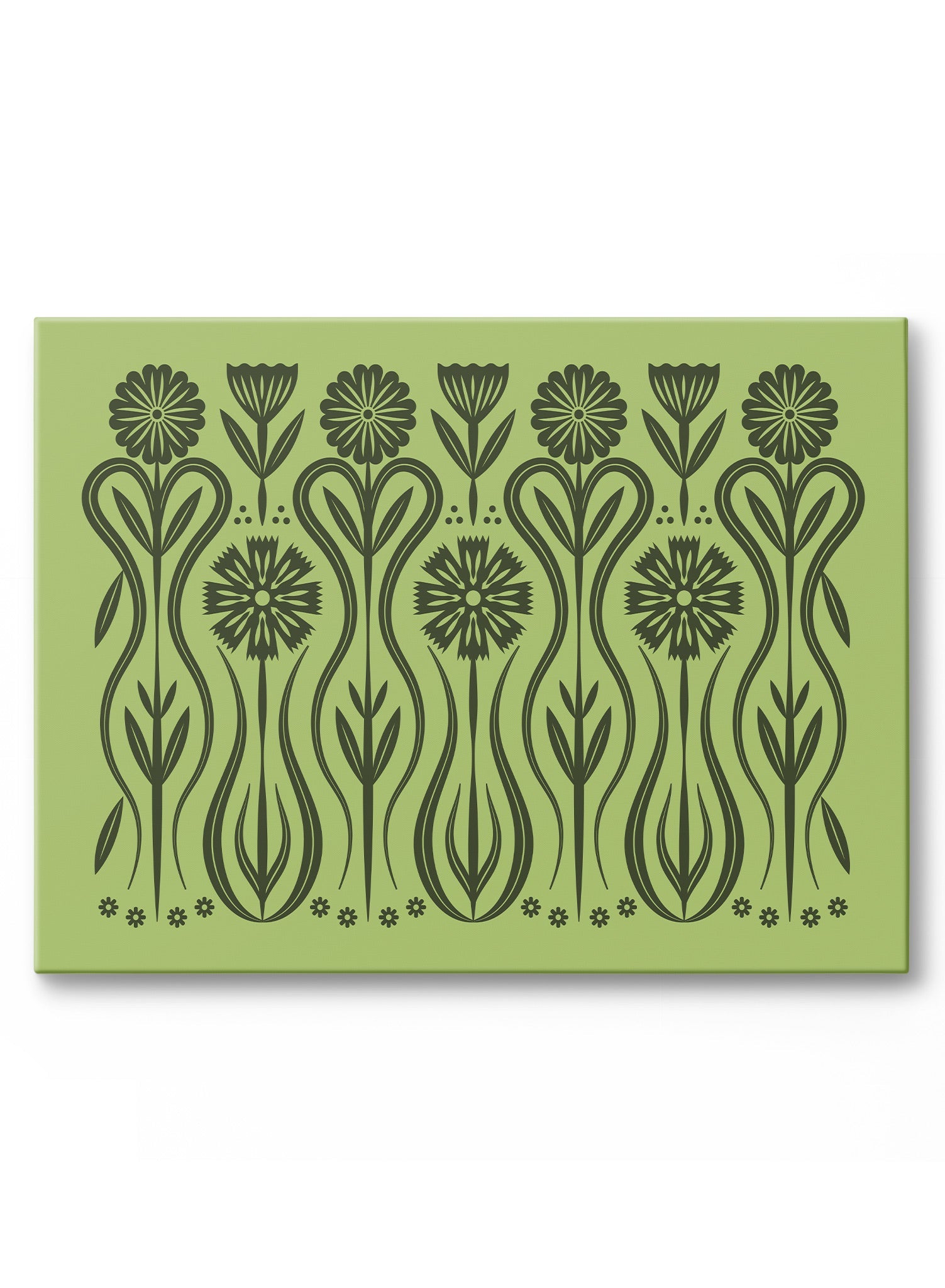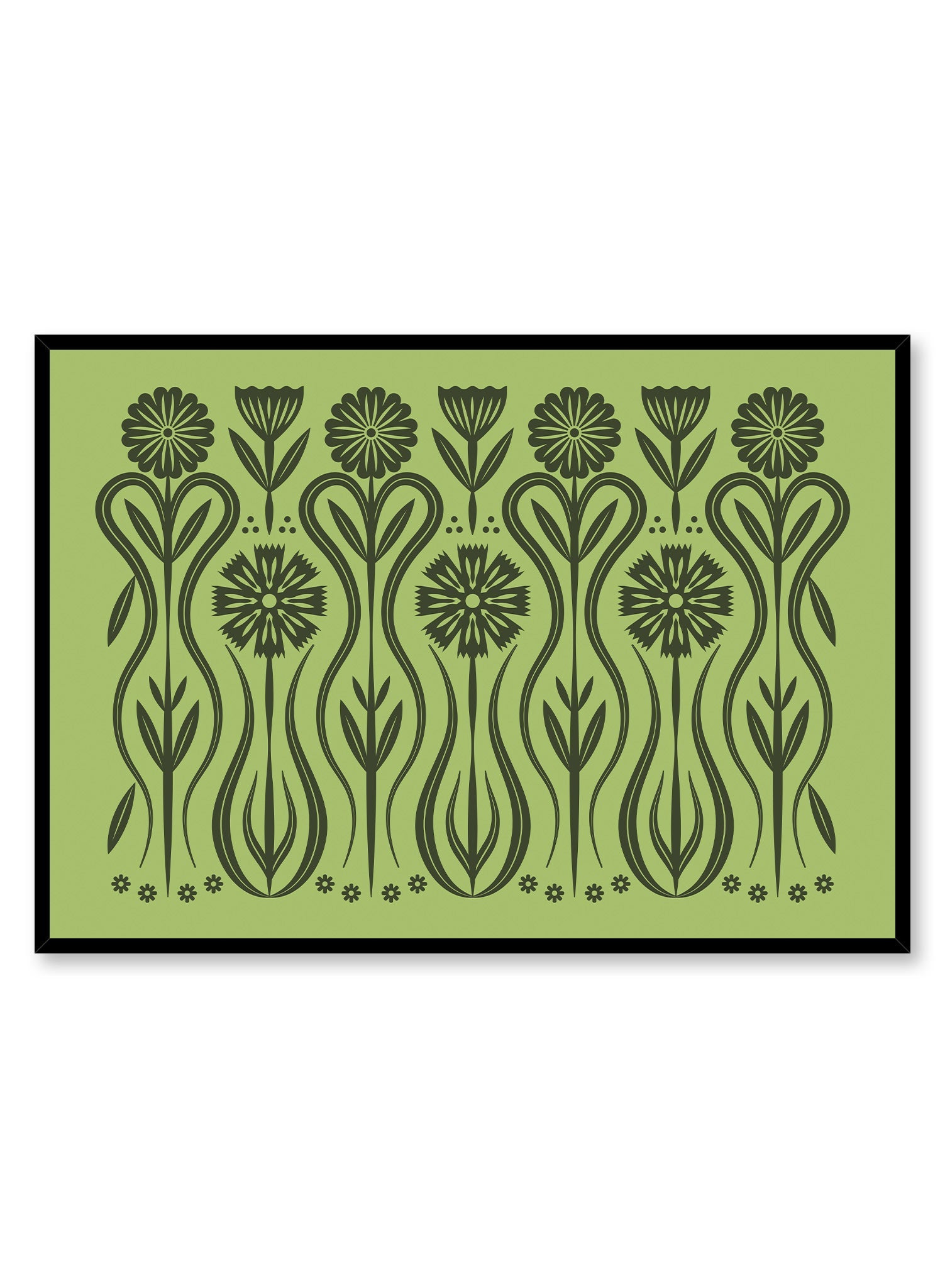 A rhythmic dance of botanical symmetry, this print by Bailey Sullivan turns flora into folklore. Stylized stems weave and unfurl into delicate blossoms, their forms echoing vintage embroidery and folk-art motifs. The deep forest green lines stand in striking contrast against a muted moss background, creating a pattern that feels both timeless and contemporary.
